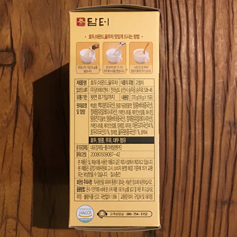 ダムト クルミ アーモンド はと麦茶 호두,아몬드,율무차(クルミ、アーモンド、ハト麦茶) 【原材料名】砂糖、白米、ピーナッツバター、パーム油、水飴、 大豆、アーモンド、クルミ、食塩、ハト麦、かぼちゃの種、 カゼインナトリウム、レシチン、 (アレルギー;クルミ、ピーナッツ、大豆、パーム油を含む) 【内容量】270g(18gX15包) 【原産国】大韓民国 【飲み方】1スティックを90ccの湯か水でといてお飲みください ◎個包装タイプでとても手軽に飲めて便利です。